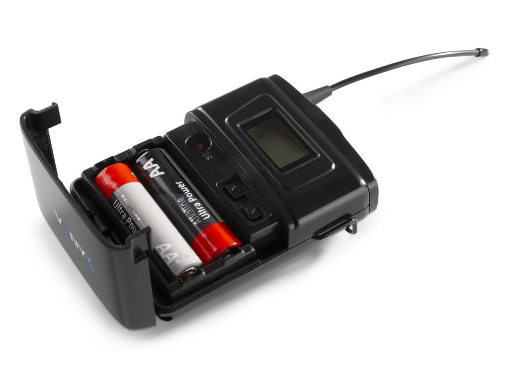 - Bodypack s displejom zobrazujúcim indikáciu frekvencie a vybitia batérie