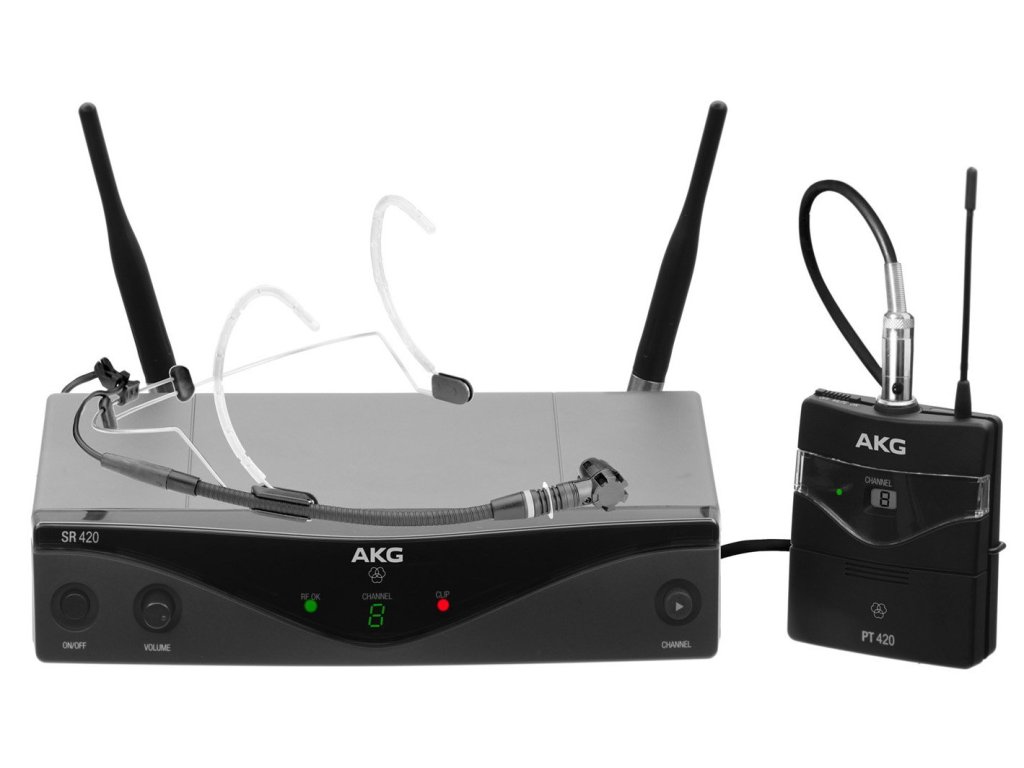 AKG WMS 420 Headset/A je bezdrôtový systém pracujúci v pásme A (530.025 – 559.000 MHz), ktorý obsahuje prijímač AKG SR420, bodypack vysielač AKG PT420 a náhlavný mikrofón AKG C555 L (tento mikrofónny headset je odolný a veľmi ľahko použiteľný mikrofón s výnimočným pomerom výkon/cana. Je ideálnou voľbou pre všetkých, ktorí pri prezentácii potrebujú slobodu pohybu a voľné ruky, ako sú cvičitelia gymnastiky, prednášajúci, rečníci, moderátori, inštruktori, konferenciéri a ďalší. C 555 L drží veľmi stabilne svoju pozíciu a pritom nijako neobmedzuje komfort užívateľa. Vďaka svojej flexibilnej konštrukcii môže byť umiestnený na ľavej aj pravej strane, vždy podľa potreby. Špeciálna konštrukcia husieho krku znižuje na minimum všetok nepríjemný manipulačný hluk. Mikrofónna vložka je vybavená ochranou proti vlhkosti, ktorá zaisťuje dlhodobú trvanlivosť, ochranu a nemennosť zvukových vlastností.