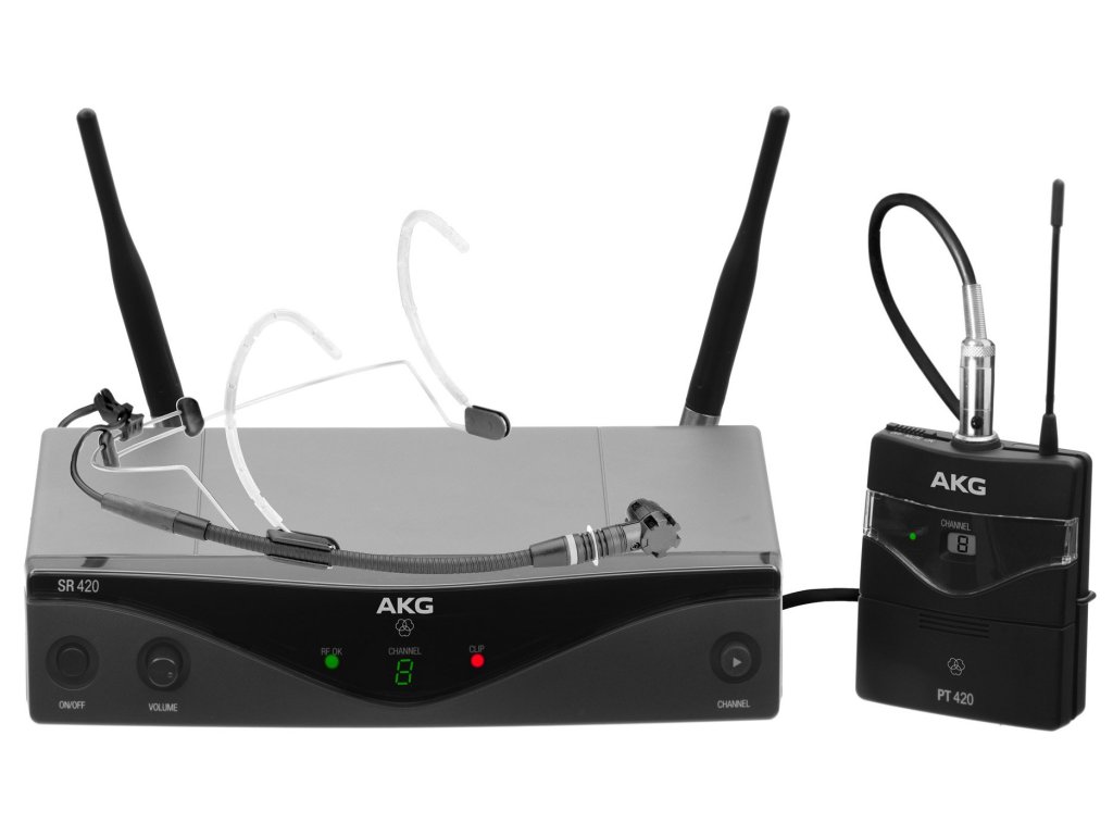 AKG WMS 420 Headset/A je bezdrôtový systém pracujúci v pásme 826.300-831.200 MHz, ktorý obsahuje prijímač AKG SR420, bodypack vysielač AKG PT420 a náhlavný mikrofón AKG C555 L (tento mikrofónny headset je odolný a veľmi ľahko použiteľný mikrofón s výnimočným pomerom výkon/cana. Je ideálnou voľbou pre všetkých, ktorí pri prezentácii potrebujú slobodu pohybu a voľné ruky, ako sú cvičitelia gymnastiky, prednášajúci, rečníci, moderátori, inštruktori, konferenciéri a ďalší. C 555 L drží veľmi stabilne svoju pozíciu a pritom nijako neobmedzuje komfort užívateľa. Vďaka svojej flexibilnej konštrukcii môže byť umiestnený na ľavej aj pravej strane, vždy podľa potreby. Špeciálna konštrukcia husieho krku znižuje na minimum všetok nepríjemný manipulačný hluk. Mikrofónna vložka je vybavená ochranou proti vlhkosti, ktorá zaisťuje dlhodobú trvanlivosť, ochranu a nemennosť zvukových vlastností.