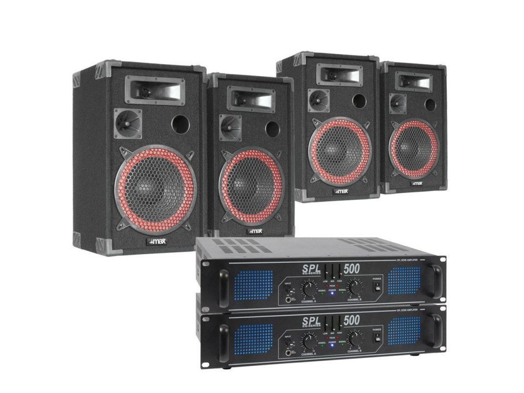 Výhodný set 2 párov reproboxov Max XEN 3508 8" 500W, 2 zosilňovačov Skytec SPL 500 2x250W a prepojovacích káblov.