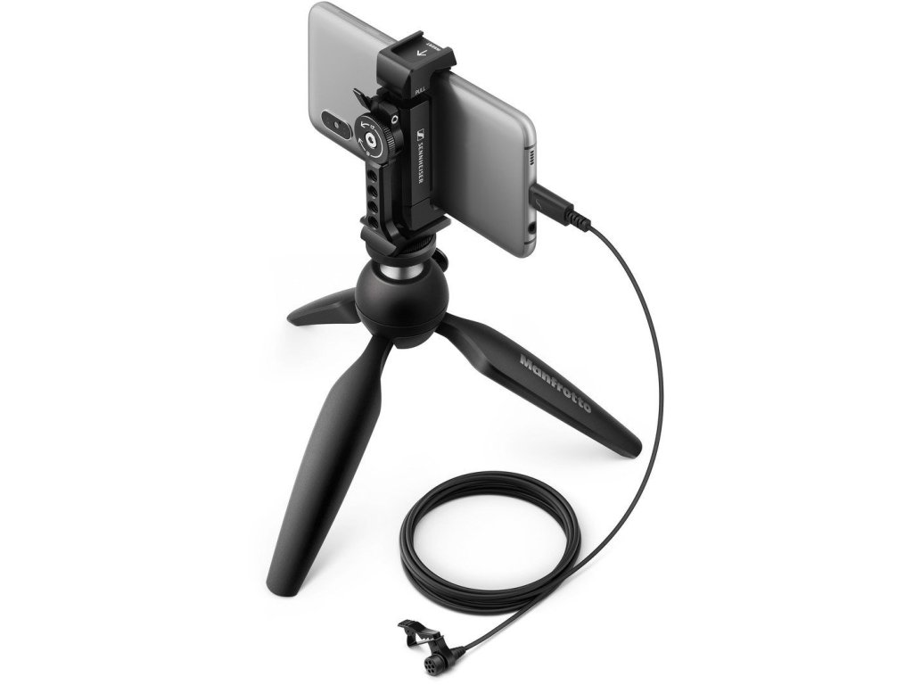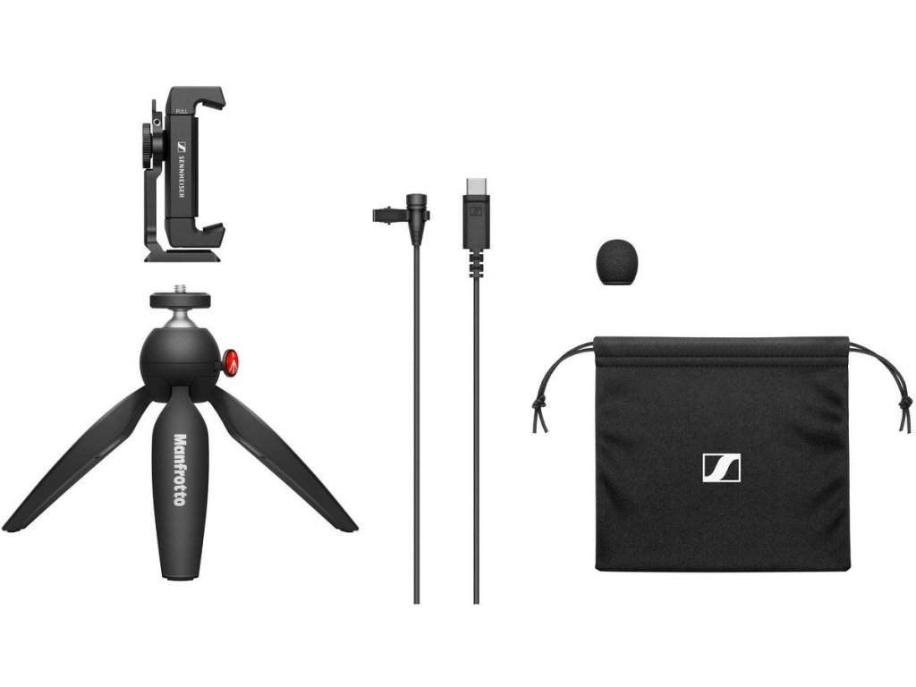 Sada klopového kondezátorového mikrofónu (konektor USB-C) s držiakom na mobil a stojanom Manfrotto pre mobilné telefóny a tablety.